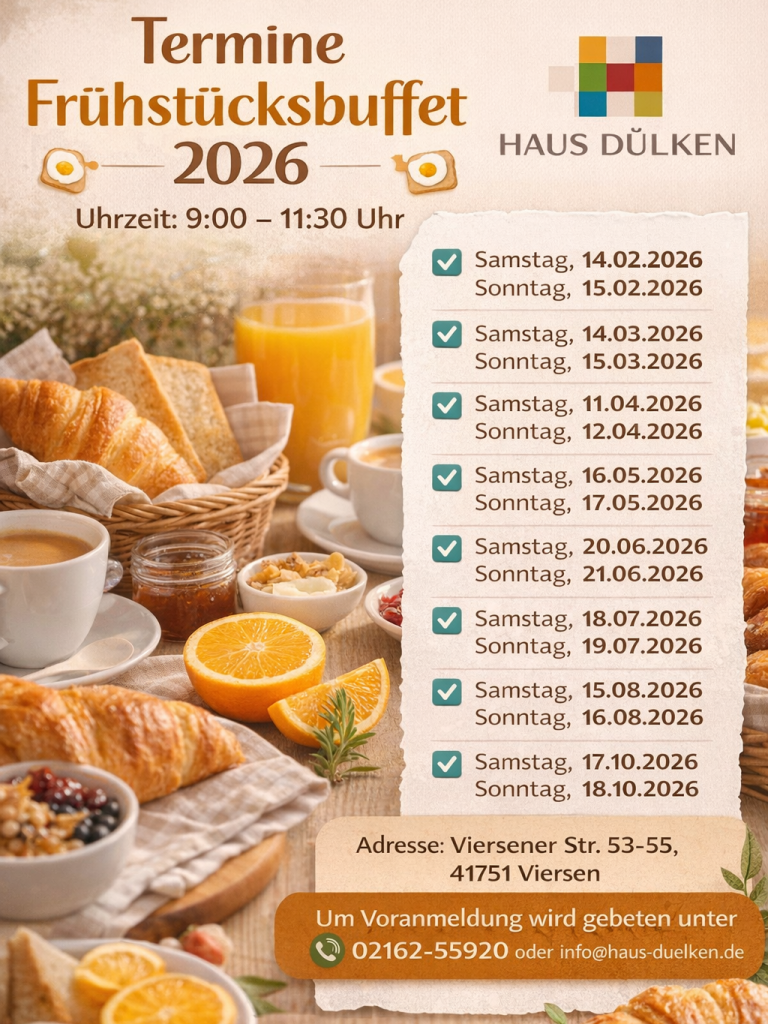 Auch im Jahr 2026 laden wir herzlich zu unseren regelmäßigen Frühstücksbuffets im Haus Dülken ein. An ausgewählten Wochenenden bieten wir die Möglichkeit, in ruhiger und angenehmer Atmosphäre gemeinsam zu frühstücken, ins Gespräch zu kommen und den Vormittag entspannt zu beginnen.
